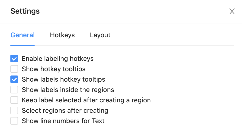 Use keyboard shortcuts, or hotkeys, to improve your labeling performance. When performing a labeling task, click the gear icon to see more details about hotkeys or to enable or disable hotkeys.