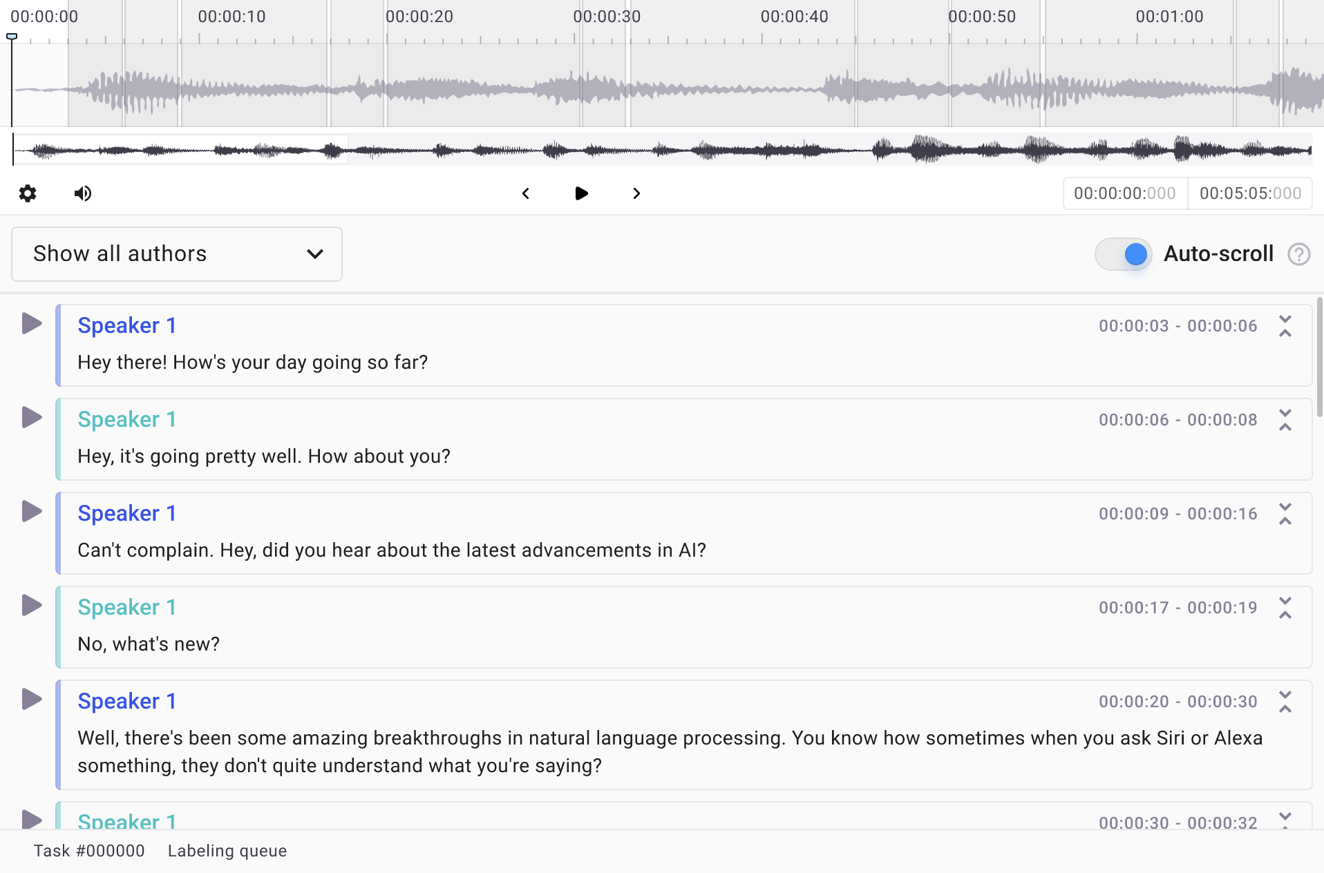Playback synchronization between audio and corresponding paragraph segments provides you with enhanced context and control resulting in high-quality annotated datasets and increased productivity when performing conversational analysis.