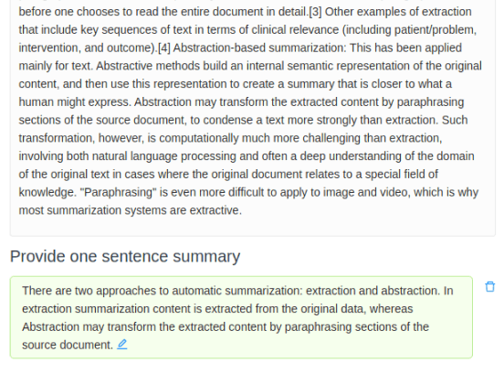 Use the TextArea control tag to provide a text box with a submit button that annotators must type a summary into and can edit their responses: